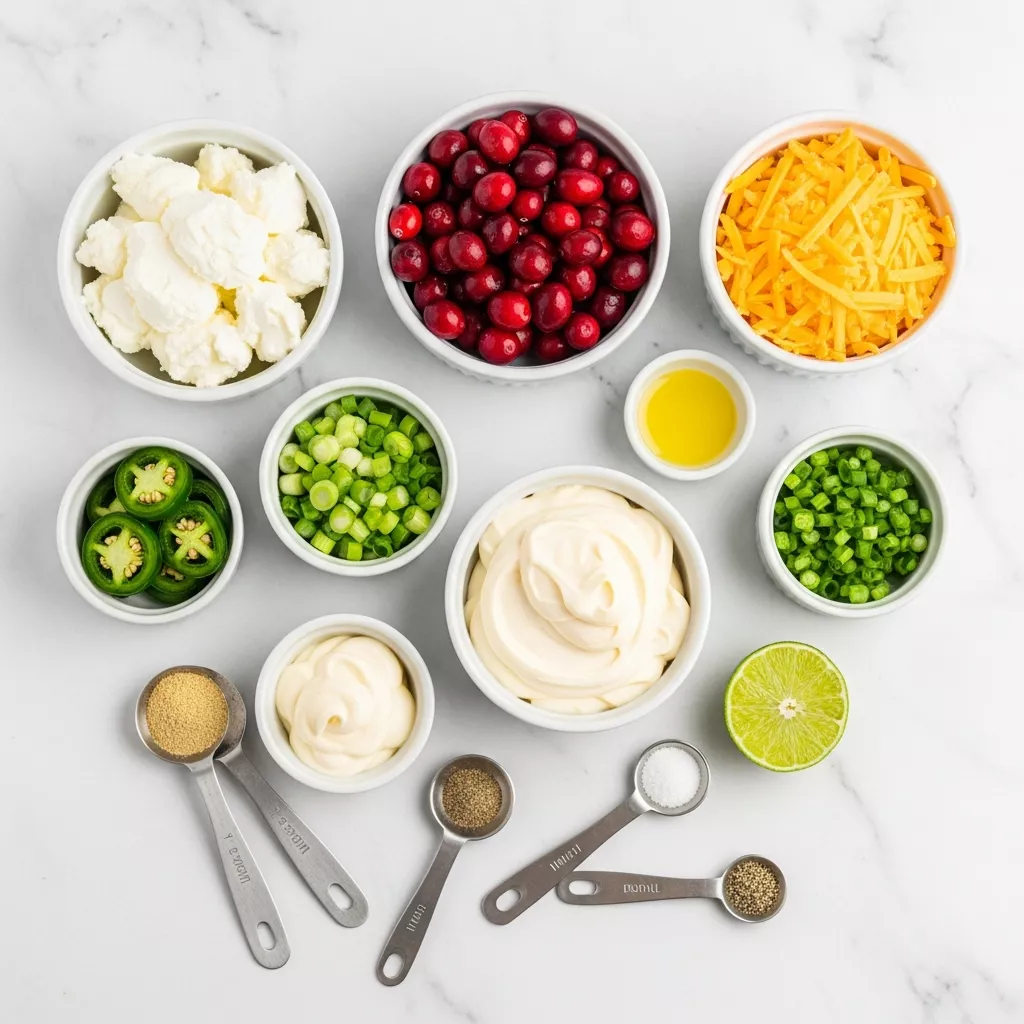 - In a medium bowl, combine softened cream cheese, chopped cranberries, shredded cheddar cheese, green onions, minced jalapenos, mayonnaise, lime juice, and garlic powder. Mix well until all ingredients are evenly distributed.